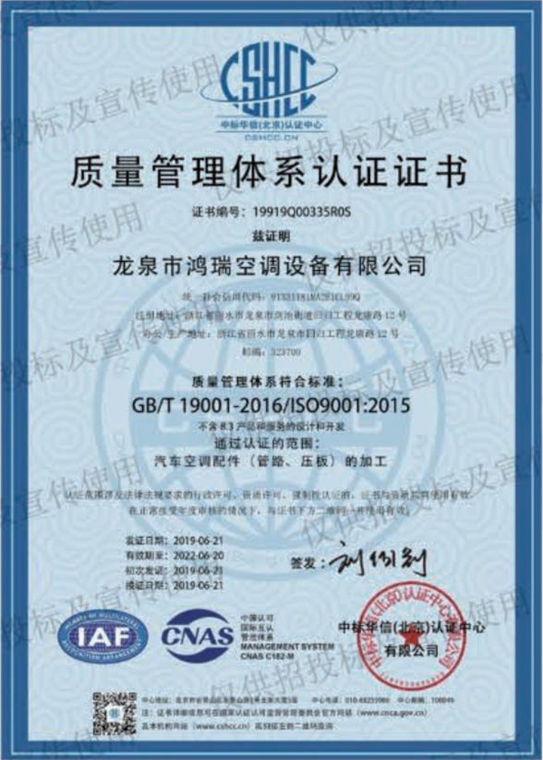 浙江龙泉市鸿瑞空调设备有限公司坐落于浙江绿谷-宝剑之邦--龙泉市,公司创建于2014年,拥有加工中心、数控车床、旋槽机、端头成型机、弯管机等先进设备和精密的检测设备,是一家专业生产干燥瓶、储液干燥器,汽车空调冷凝器、蒸发器、油冷器、水箱等配套的接头、压板、支架、管路及各种汽车空调配件的企业。